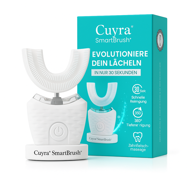 Unsere Cuyra™ Smiles- Bürste ist eine vollautomatische 30-Sekunden-Lösung, die jeden Zahn gründlich reinigt, sanft mit Kaltlicht aufhellt und die Zahnfleischgesundheit fördert – für ein saubereres, frischeres Lächeln ganz ohne Aufwand.